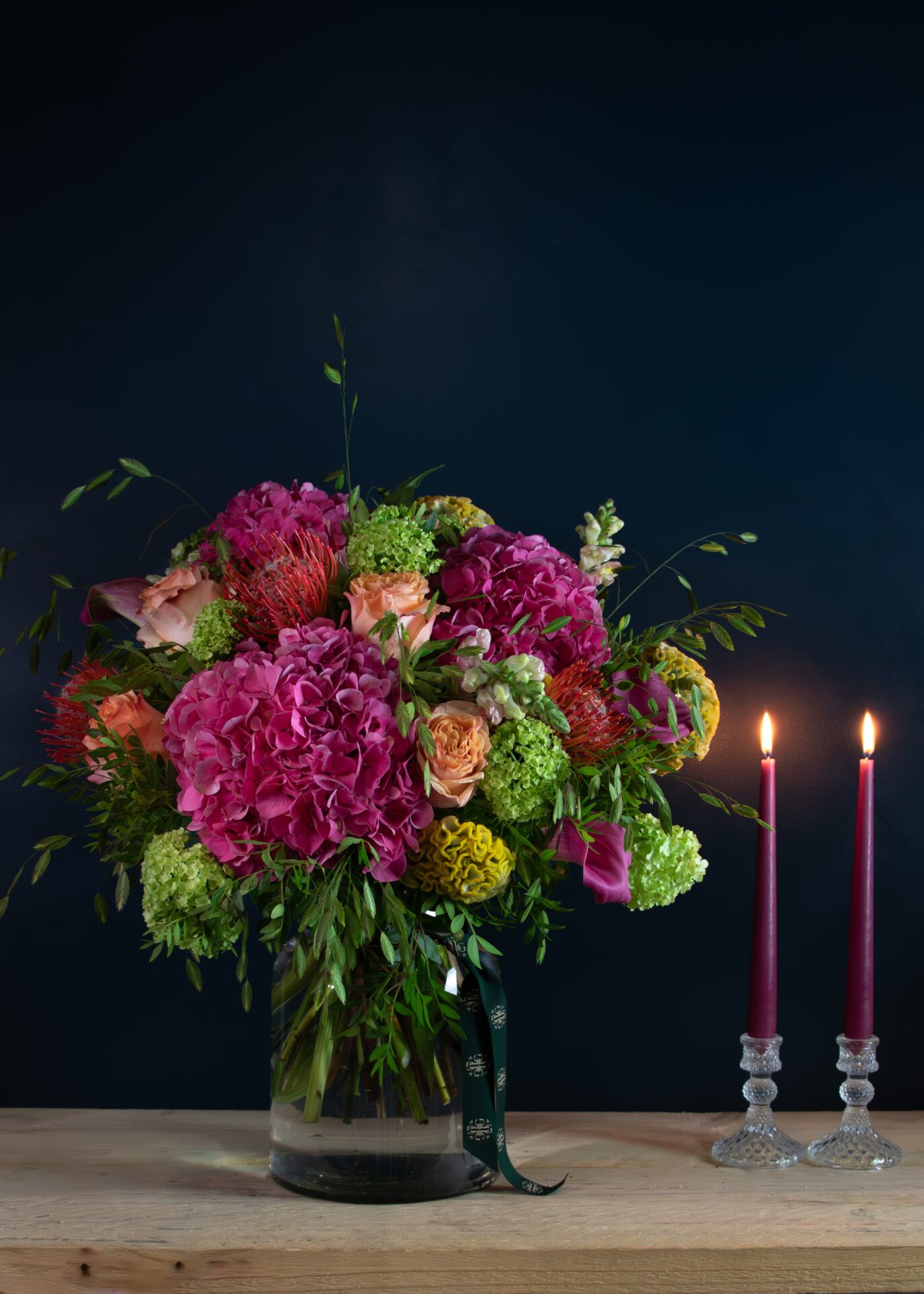A pop of colour to hang on to those last few days of summer! A Tale of Two Cities created using vibrant Caraluna rose, breathtaking Hydrangea, sunny Celosia and radiant Viburnum making us hold on to the summer and dream of whatโs to come next season.