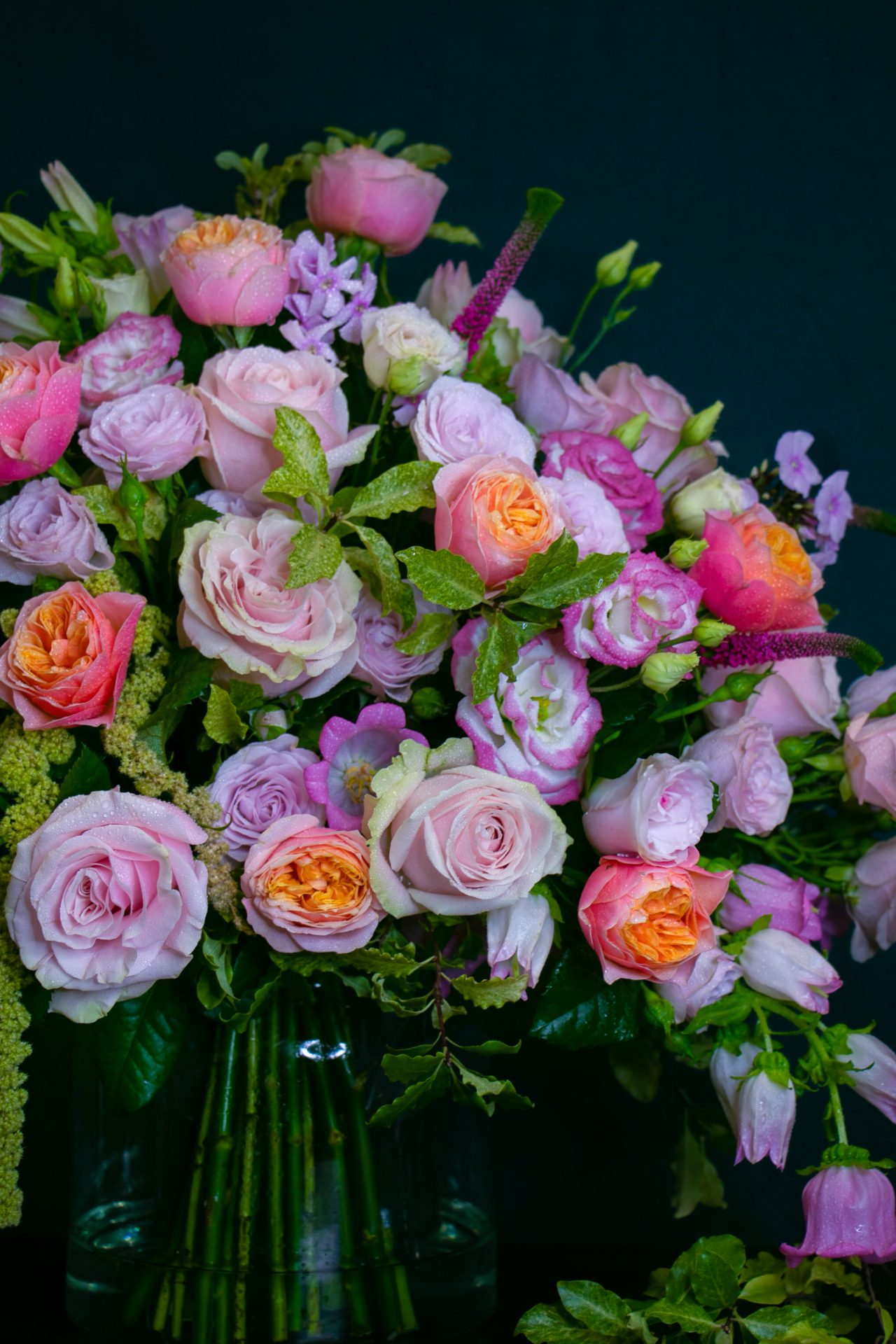 Beloved, a delicate and whimsical array of blushing pastel pinks. In this composition a new variety of Rose, Vuvuzela, a garden rose that adds a stunning contrast to its muted backdrop. Scented Phlox, the arching of Campanula bells and contrasting seasonal garden foliage, creates that just gathered array.