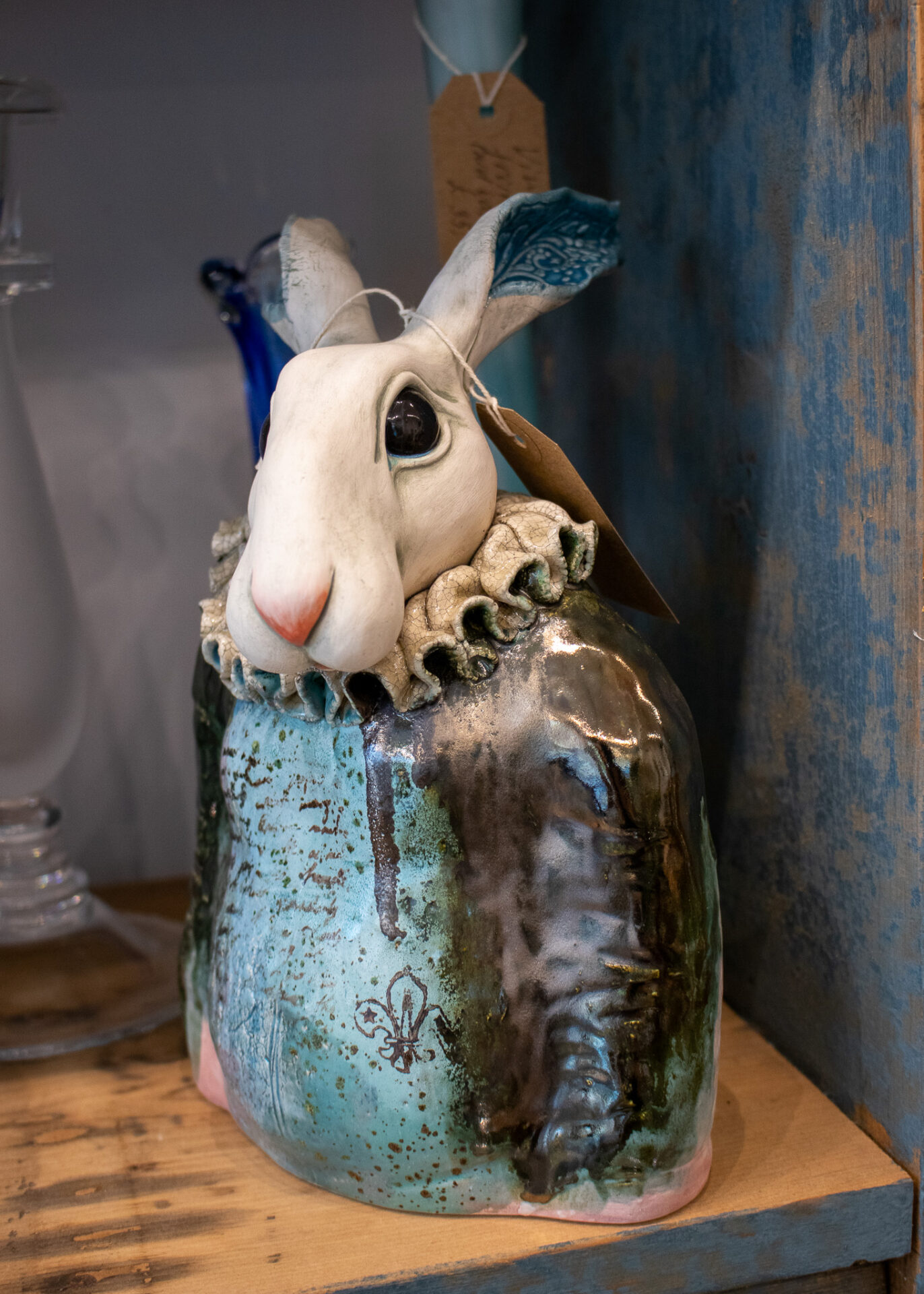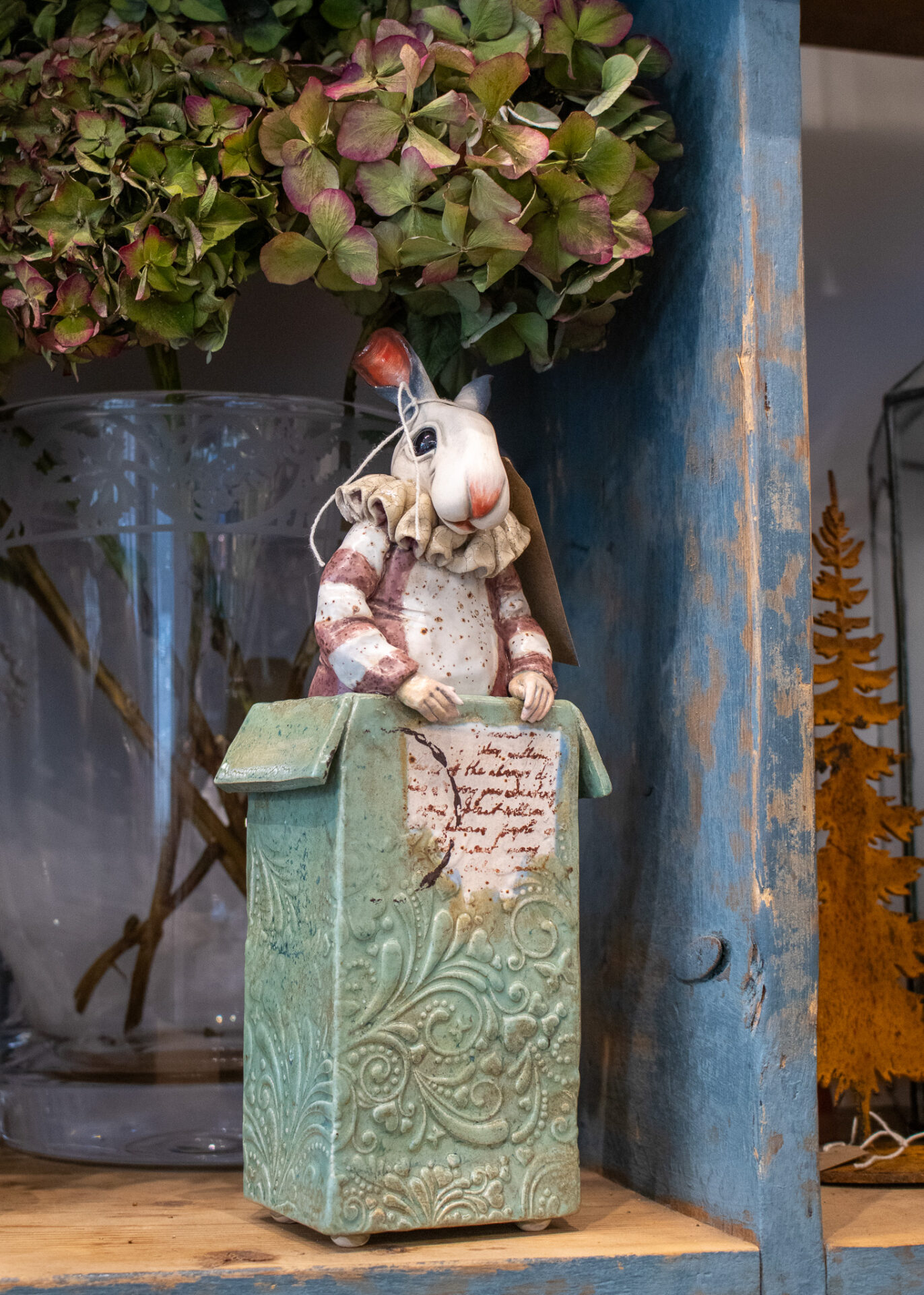 Helen’s ceramic figurative sculptures are both endearing and intriguing, seeming to have their own personal character and mannerisms. Recent work features animal and human figures wearing โ€˜dress-upโ€™ costumes or โ€˜onesiesโ€™ and sometimes wearing hooded tops or masks. The artist is fascinated by the idea of disguise or incognito. The figures are often an analogy for how people often hide a fragile self-esteem behind a robust faรงade or disguise, often pretending to be what they are not. Some figures have narrow openings literally cut into their bases like scars. The viewer is invited to peer into them to slowly reveal sentimental objects or details and dรฉcor on the walls of the interior, revealing the โ€˜beauty withinโ€™. Helen works from home in a small studio near the historic South Wales town of Merthyr Tydfil. She has a background in window dressing and figurine painting and taught Secondary Art and Design. She studied Ceramics at UWIC in Cardiff where she achieved 1st class BA Hons Degree, graduating in 1997.