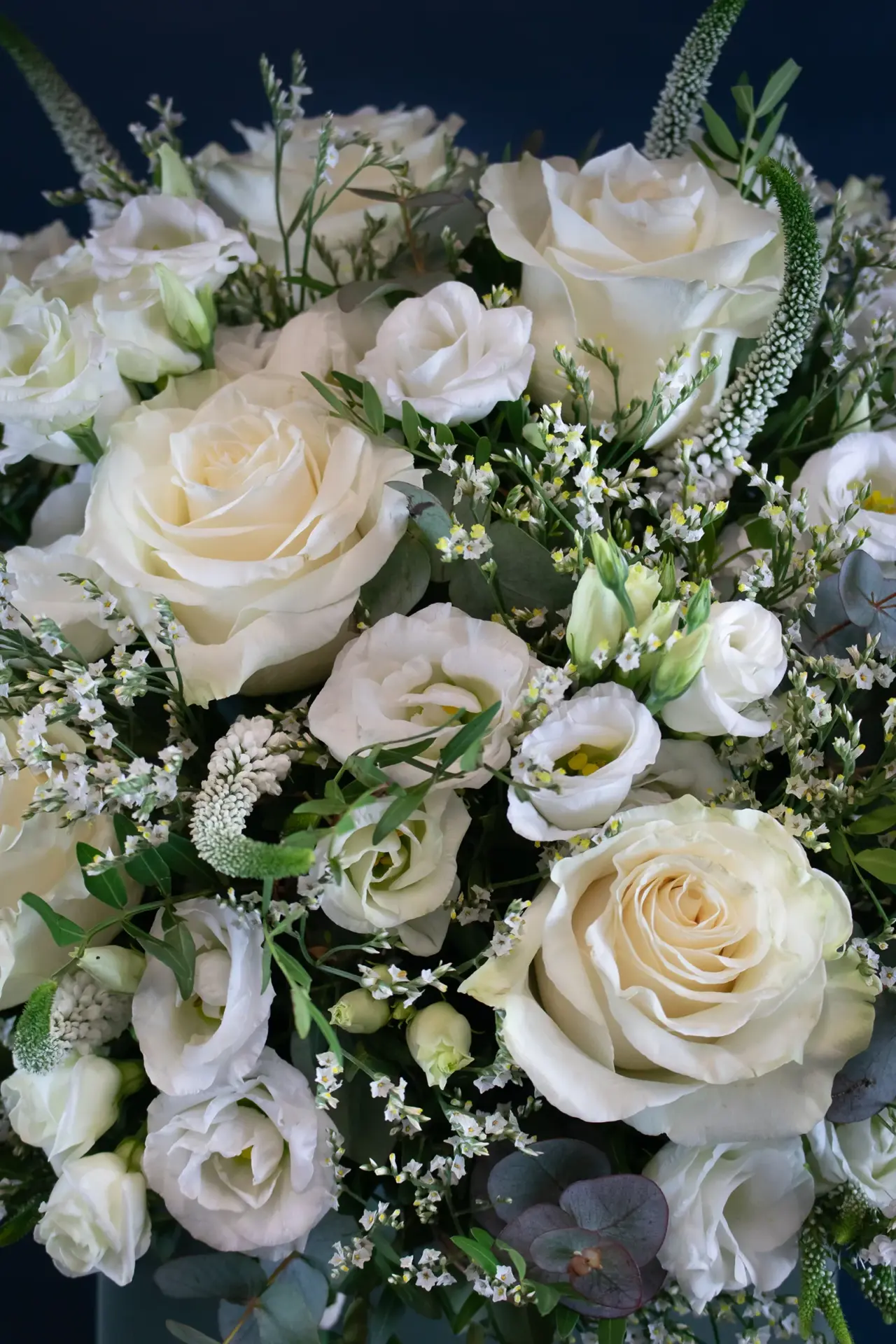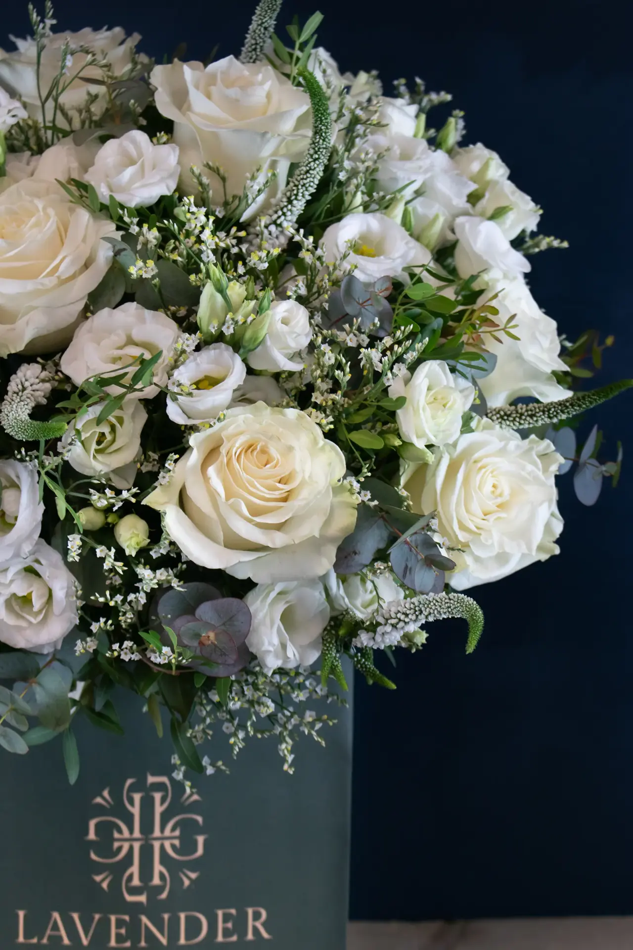 Roses, Lisianthus, Limonium and Veronica with mixed seasonal foliage