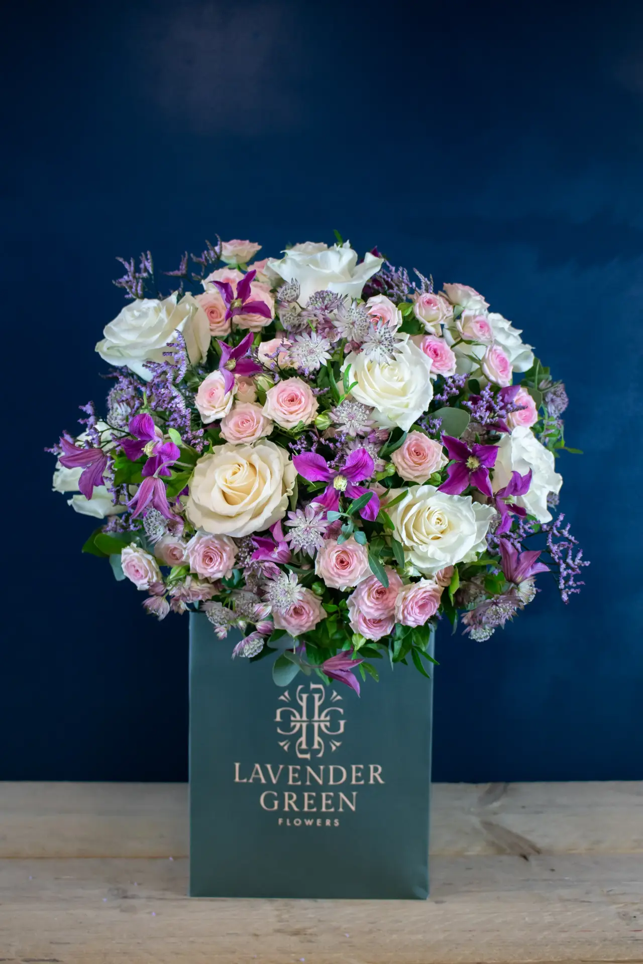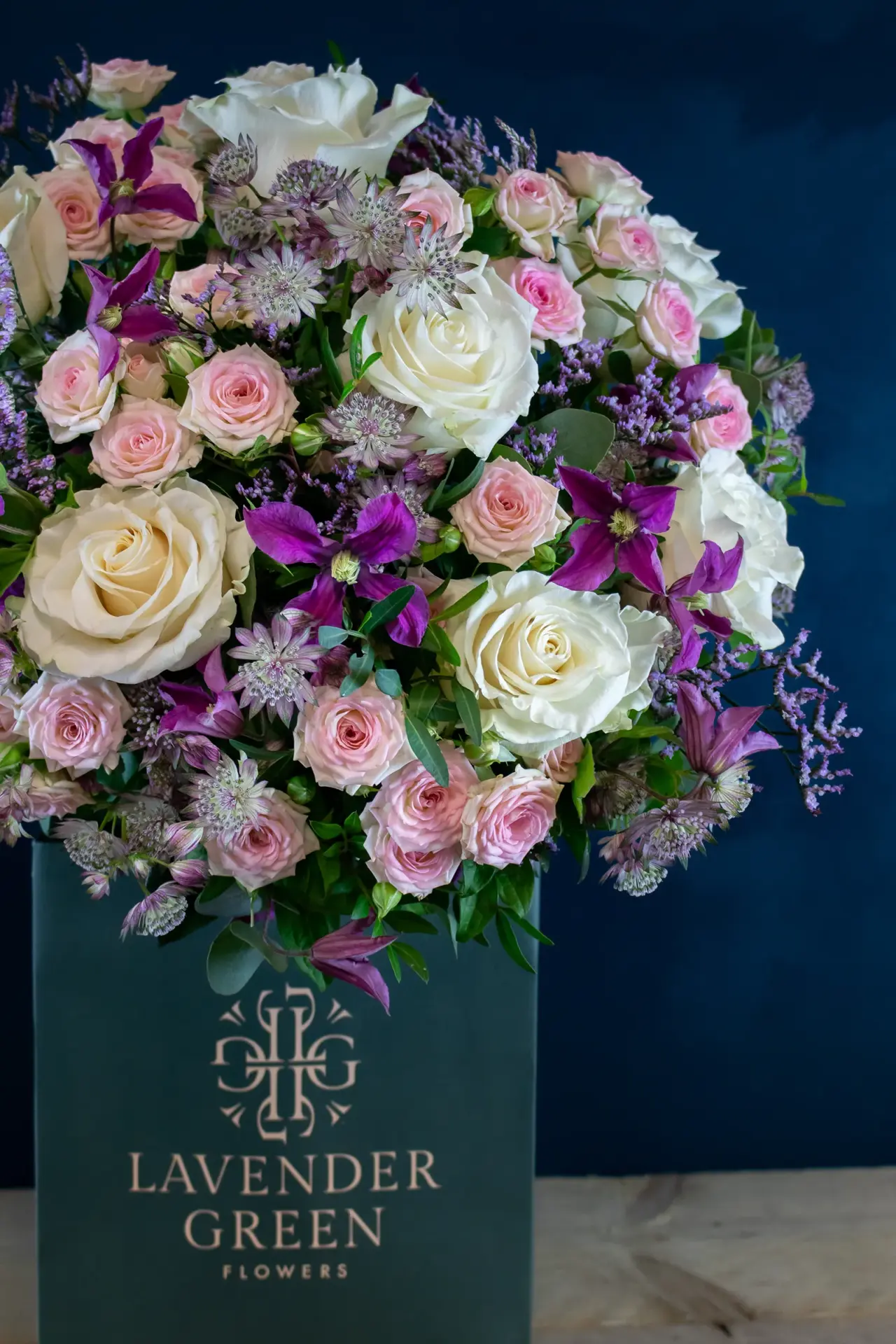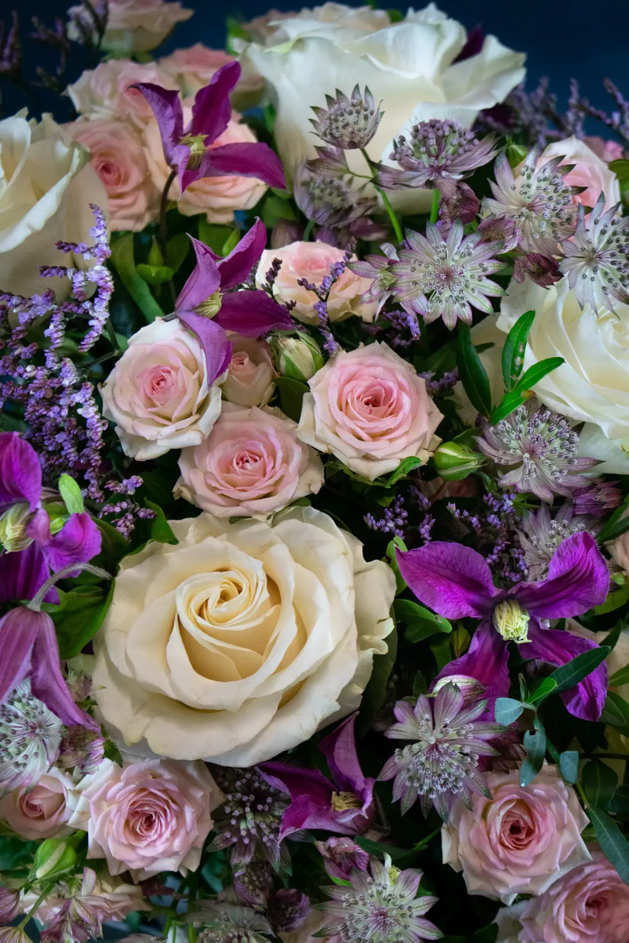 Roses, Spray Roses, Astrantia, Clematis and Limonium with mixed seasonal foliage