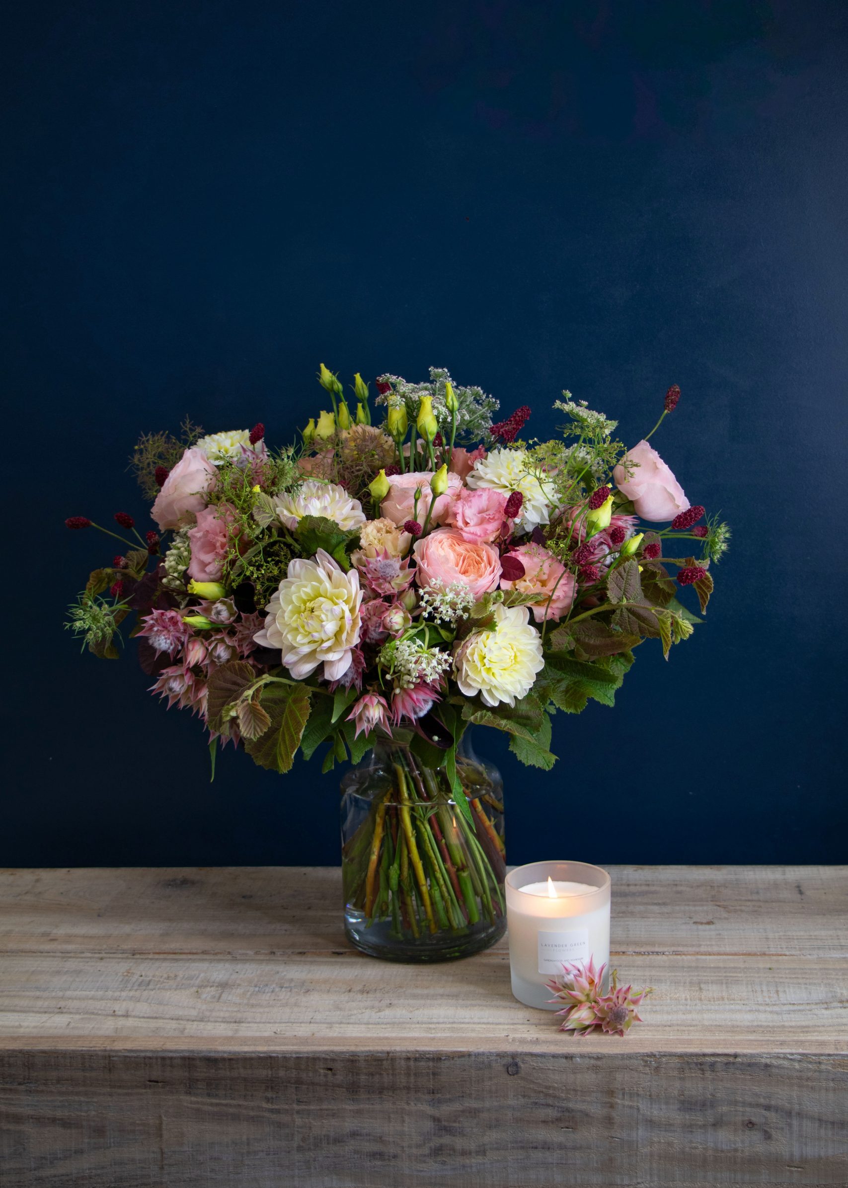 Let your imagination bloom with The Making History, a whimsical floral arrangement inspired by the romantic beauty of the English countryside. This stunning bouquet features a harmonious blend of blush garden roses, soft Ammi, pink Lisianthus, and textural Bridal Protea. Accents of raspberry Sanguisorba and seasonal favourite Dahlias add depth and vibrancy, all complemented by loose, natural foliage. Designed to evoke the essence of an English garden, this arrangement brings timeless elegance and botanical charm to any interior space.