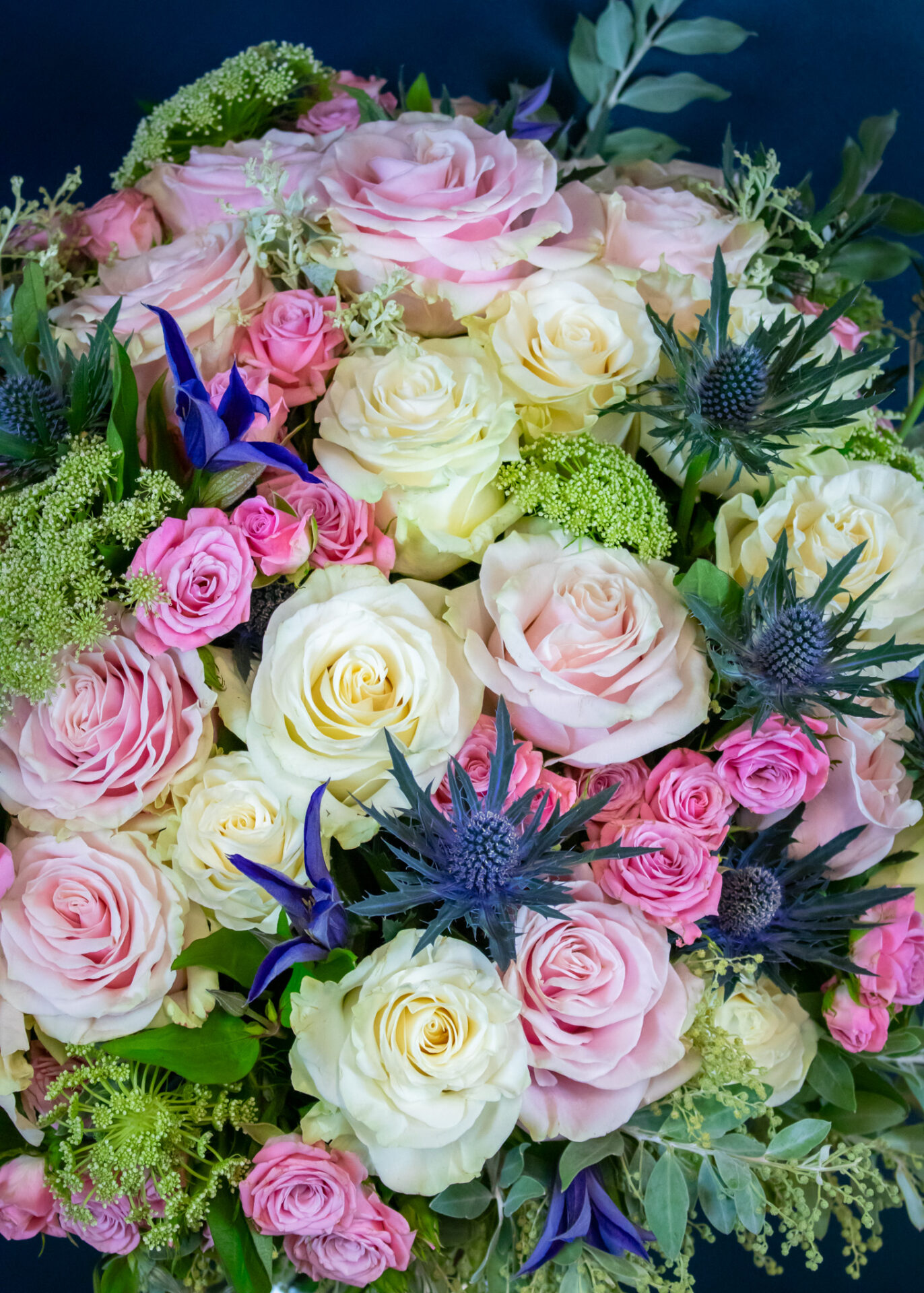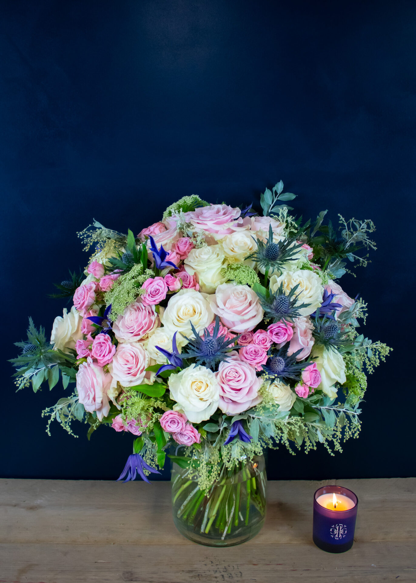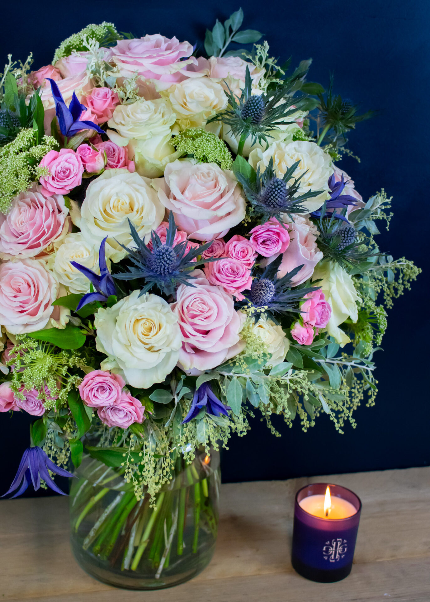 Featuring pink Mondial and white Mondial roses for classic elegance, paired with purple clematis and blue thistle for subtle depth, this bouquet exudes refined seasonal style. Fragrant dill and silvery acacia bring a fresh, organic feel, while pale pink spray roses add a final touch of gentle romance.